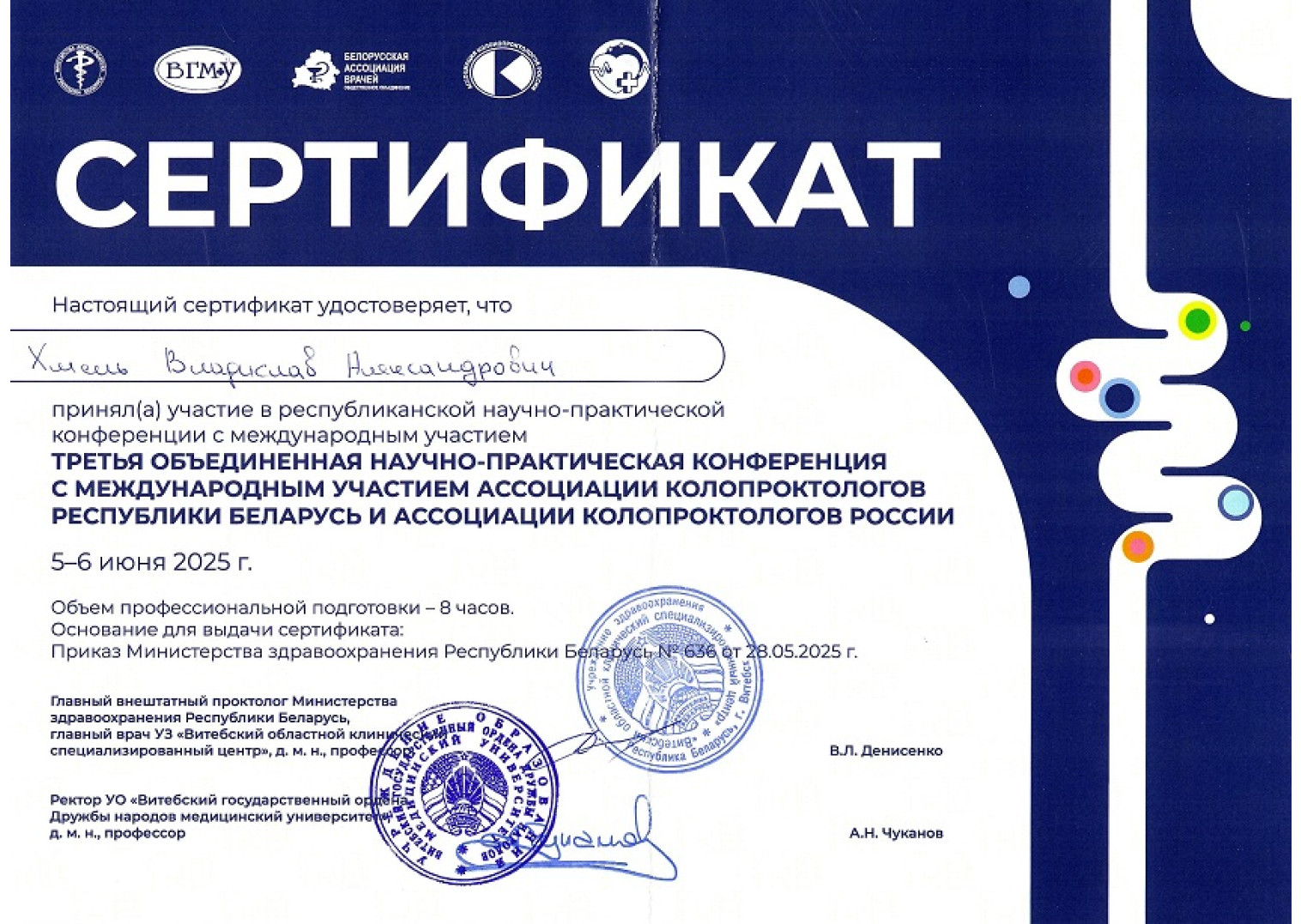 2024 г. — Принял участие в научно-практической конференции «Лапароскопические и эндоскопические методы в лечении заболеваний органов брюшной полости»