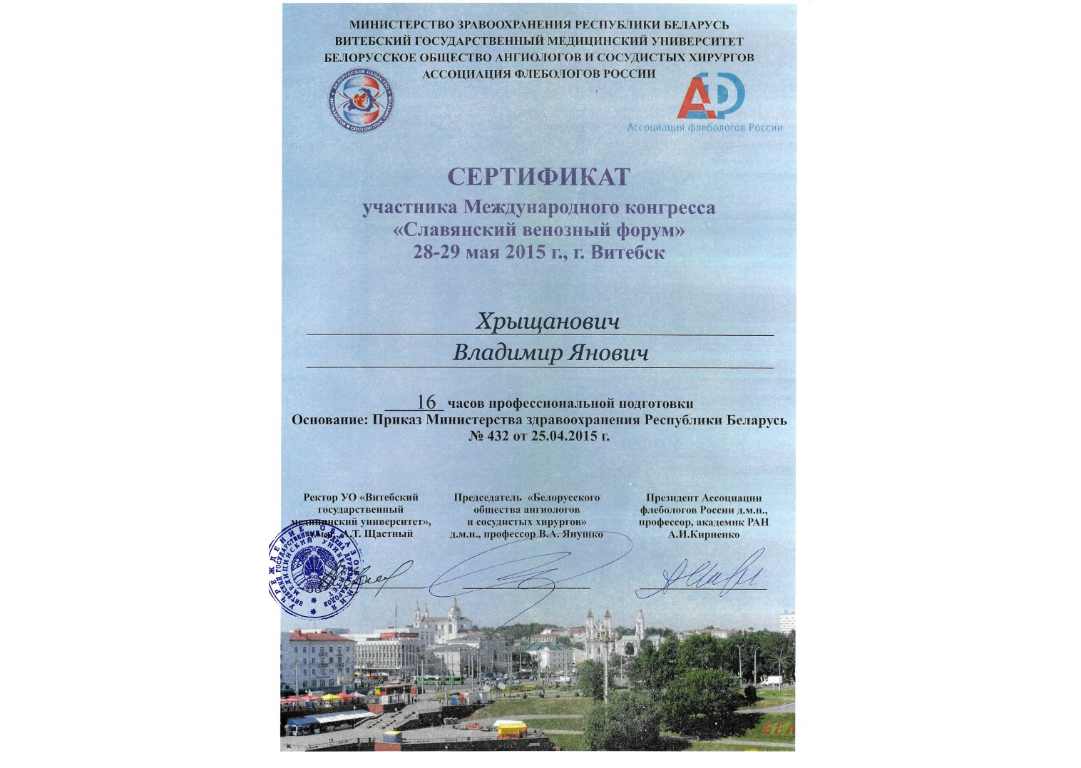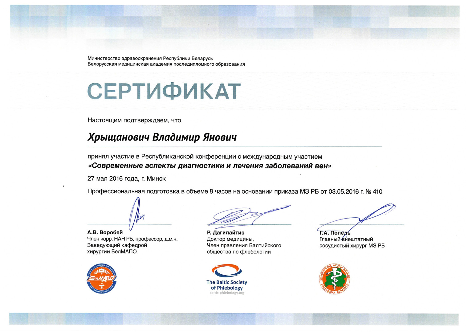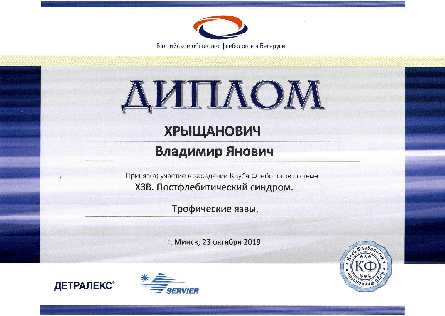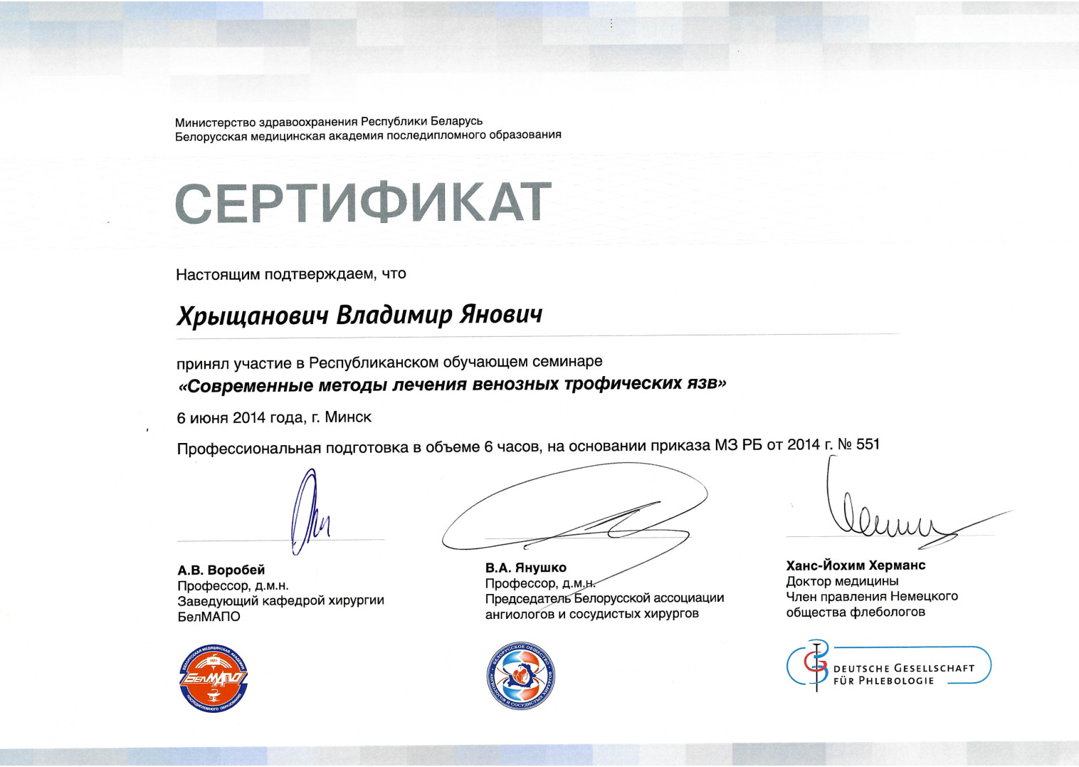 2009 г. — Курсы повышения квалификации по программе «Миниинвазивная флебология со склеротерапией»