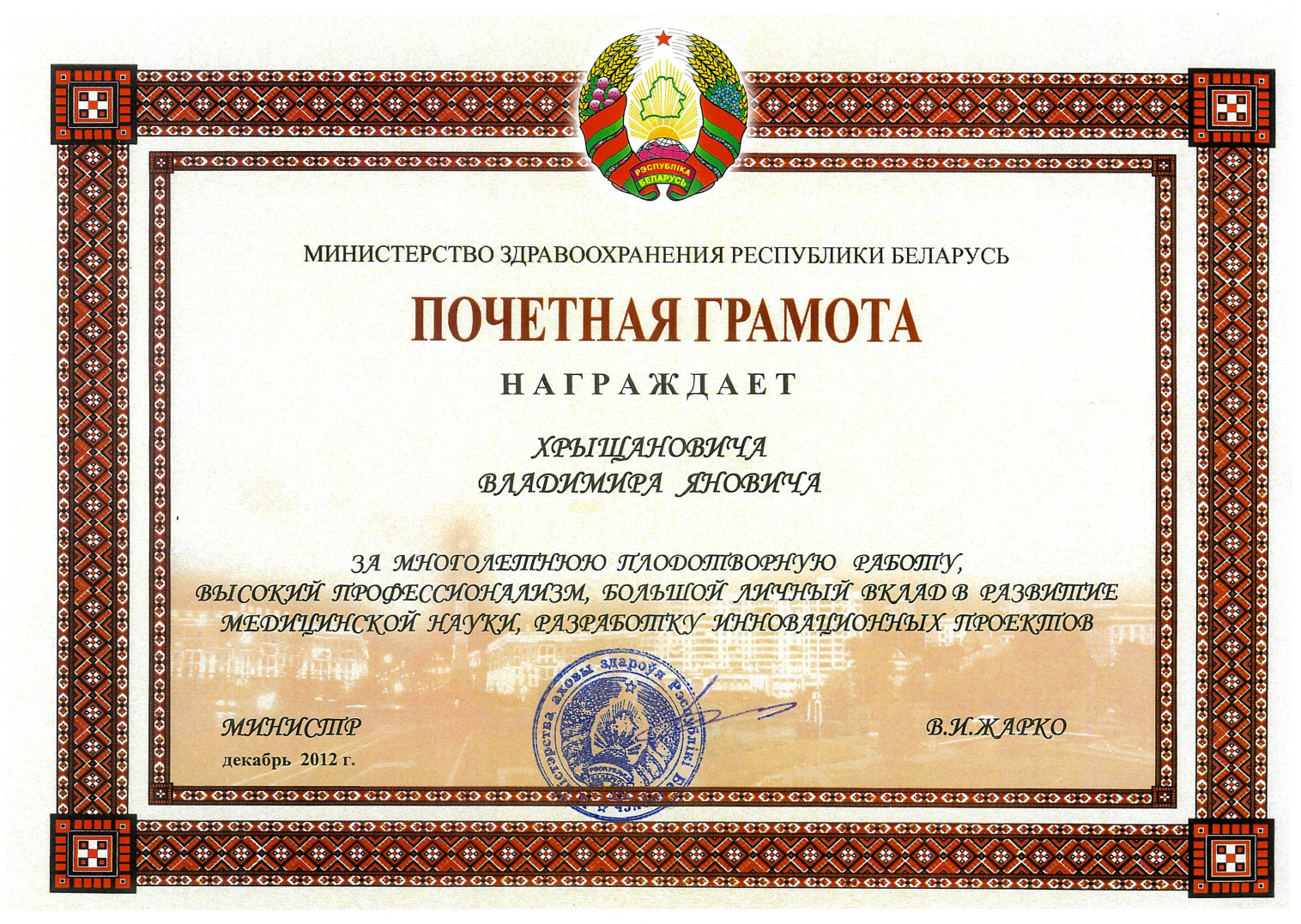 Опубликовано более 320 печатных работ в отечественных и зарубежных изданиях, в том числе 2 монографии, получено 5 патентов РБ на изобретения, утверждены МЗ РБ 6 инструкций по применению.