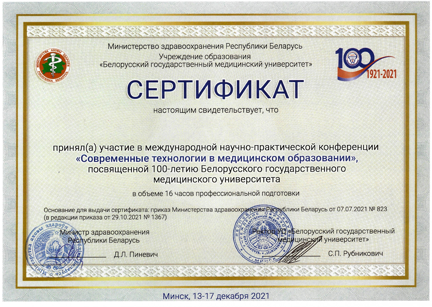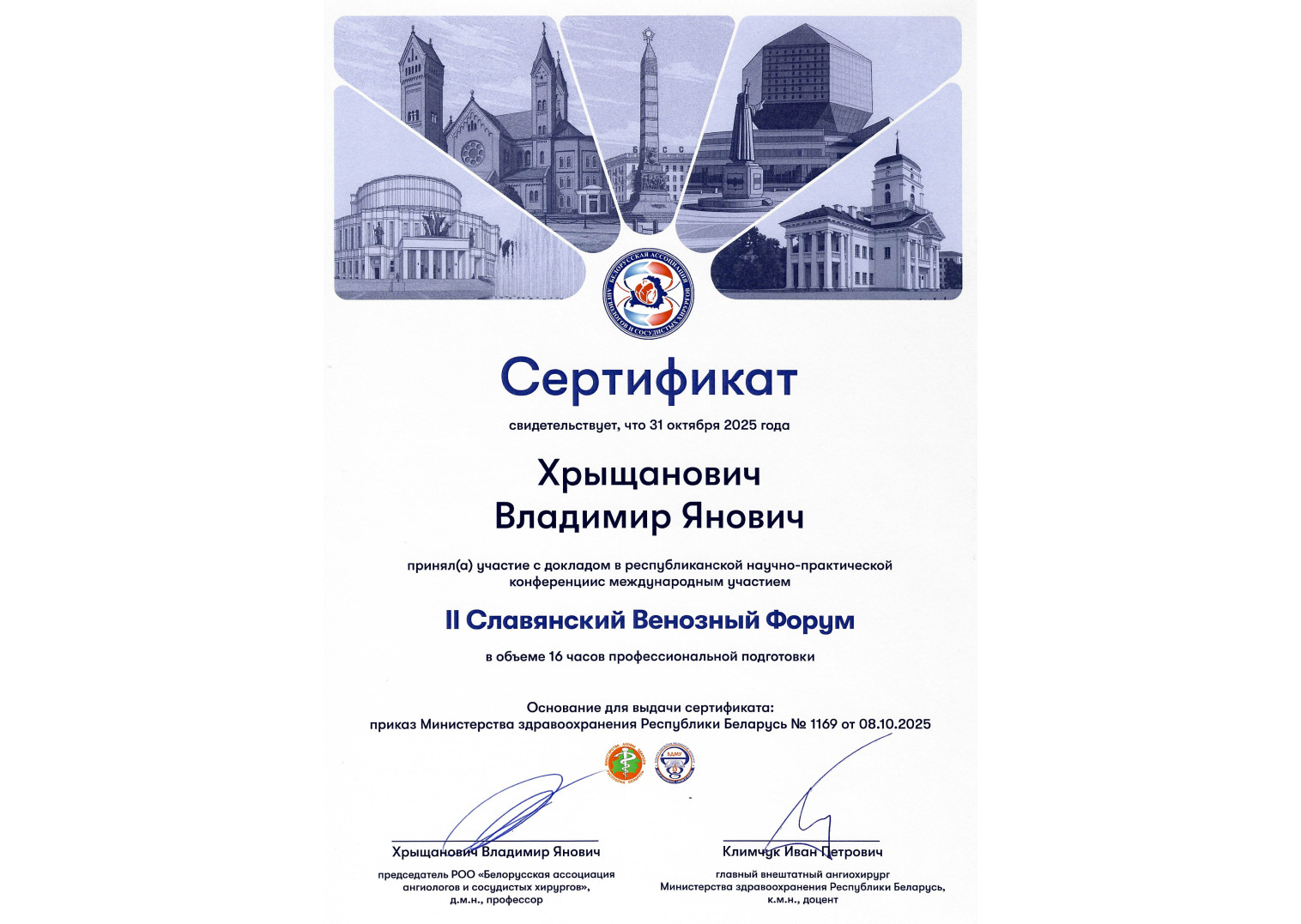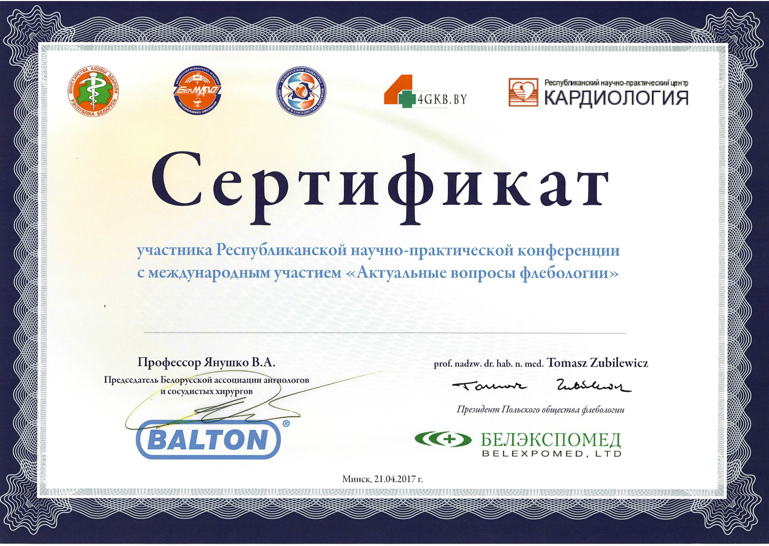 2021 г. — Курсы повышения квалификации по программе «Инновационные технологии во флебологической практике»