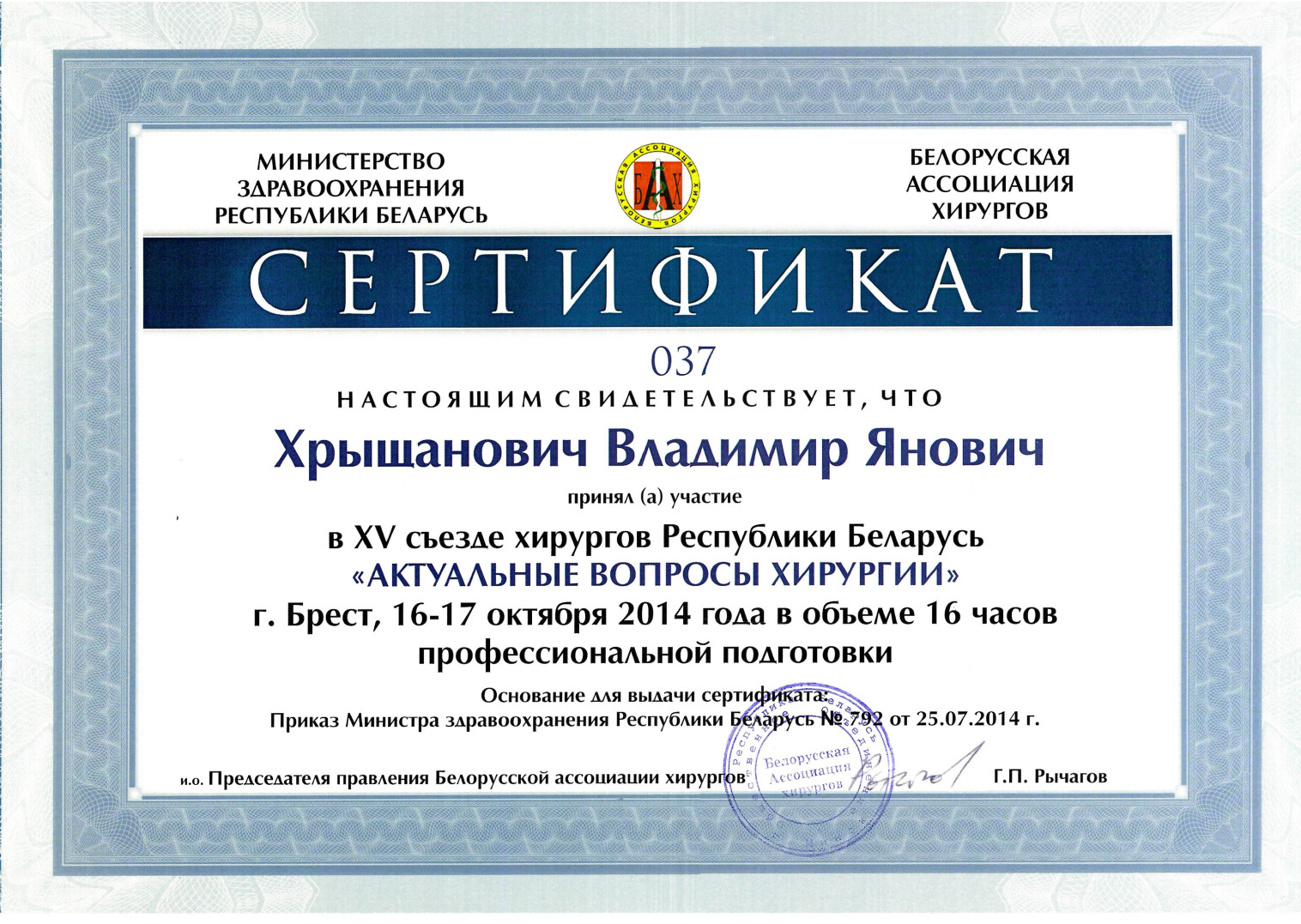 2013 г. — Курсы повышения квалификации по программе «Хирургическая гастроэнтерология»