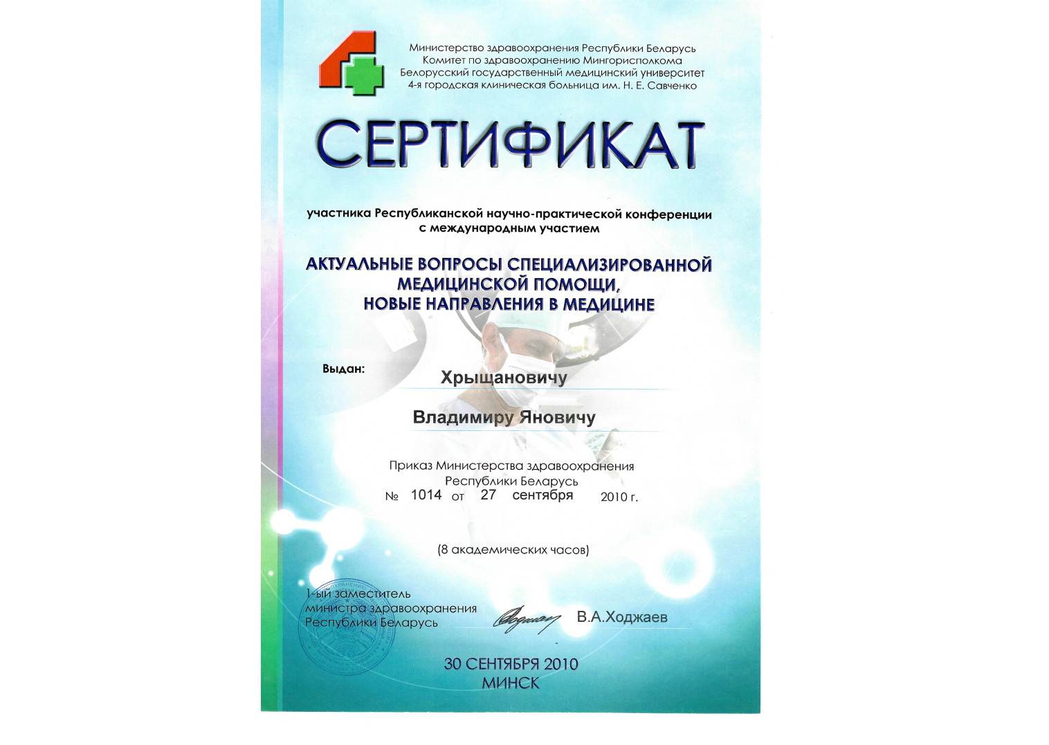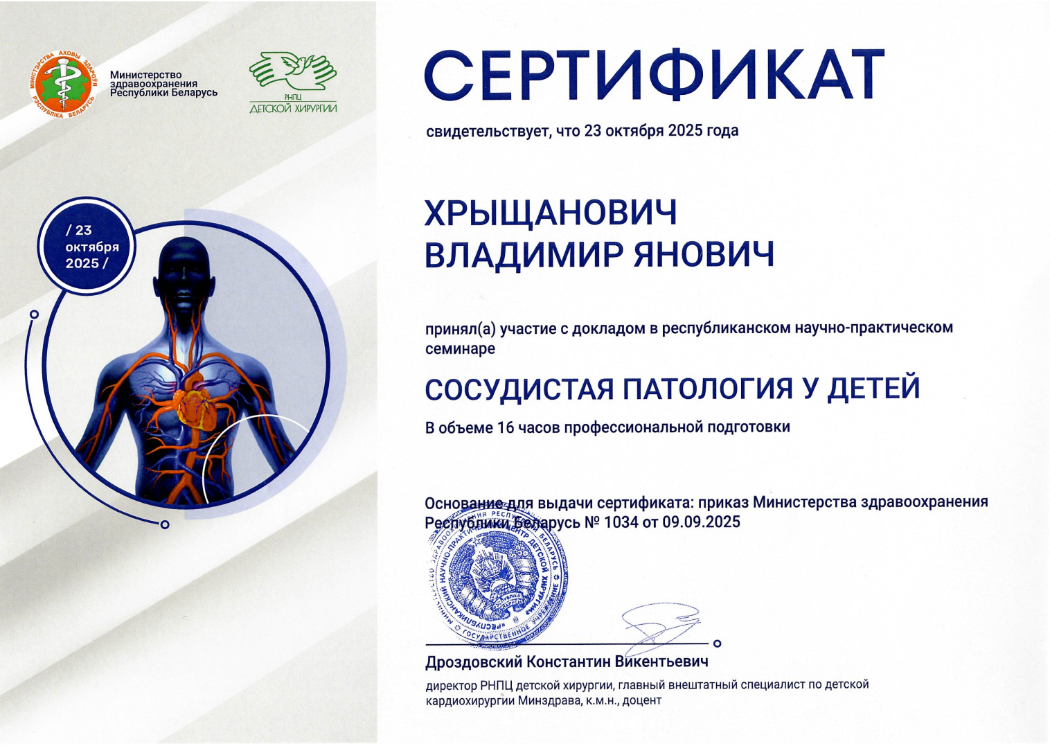 2009 г. — Курсы повышения квалификации по программе «Кардиохирургия и ангиология»
