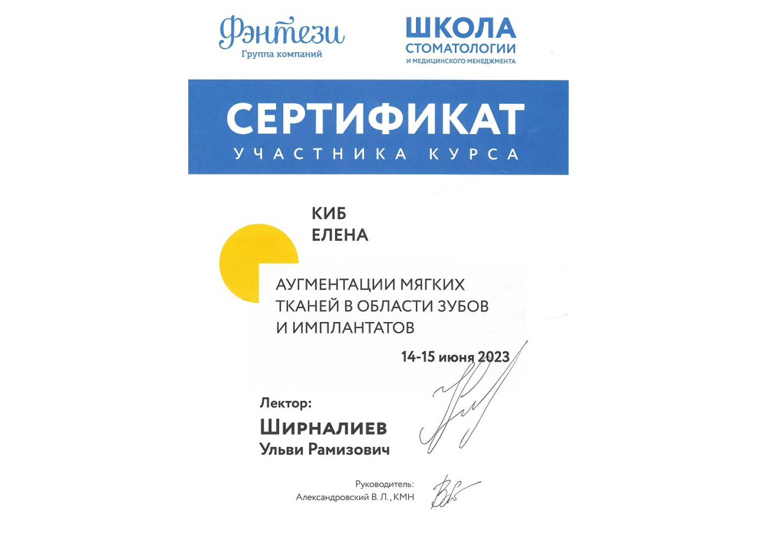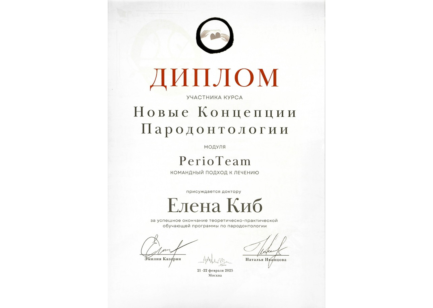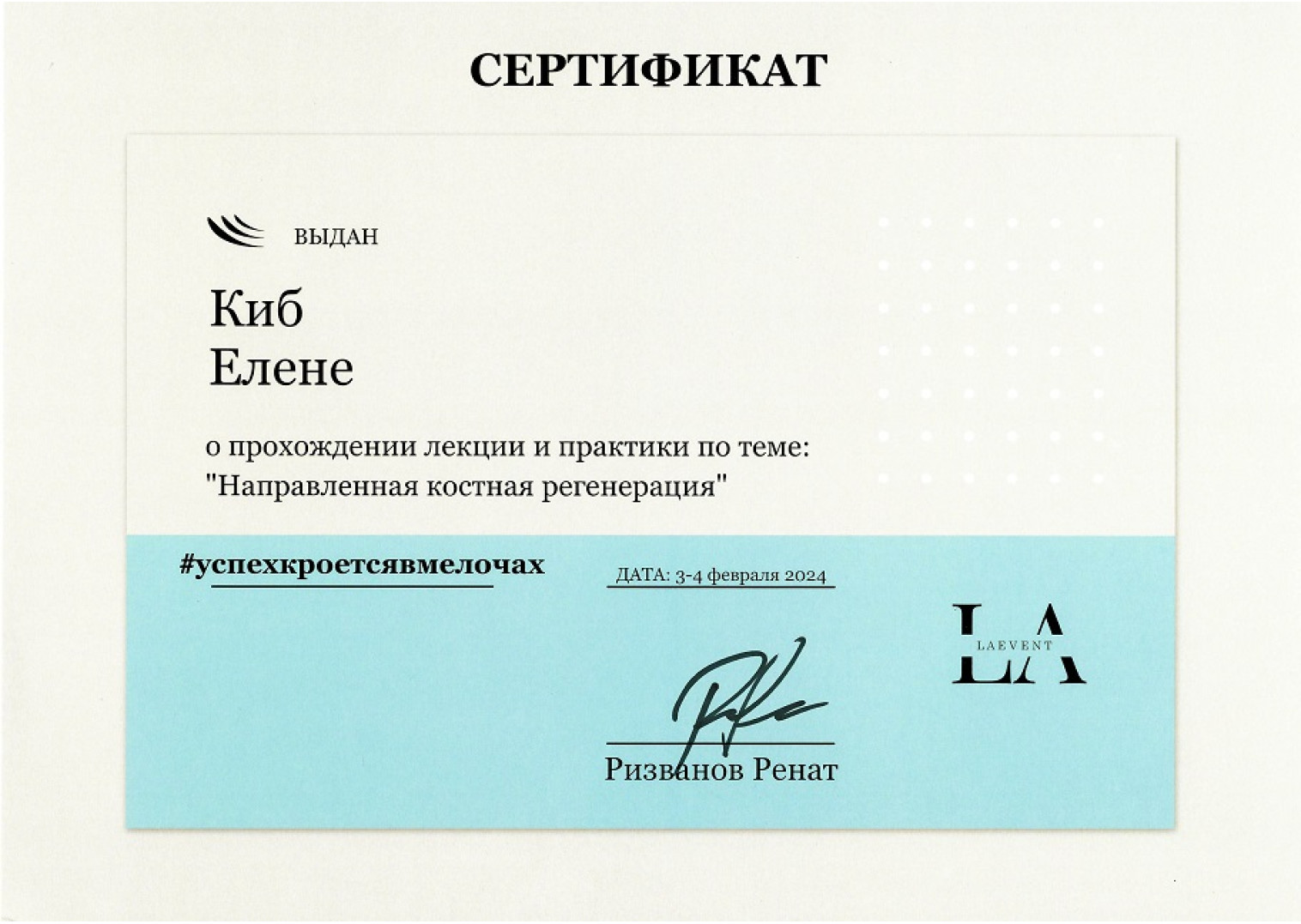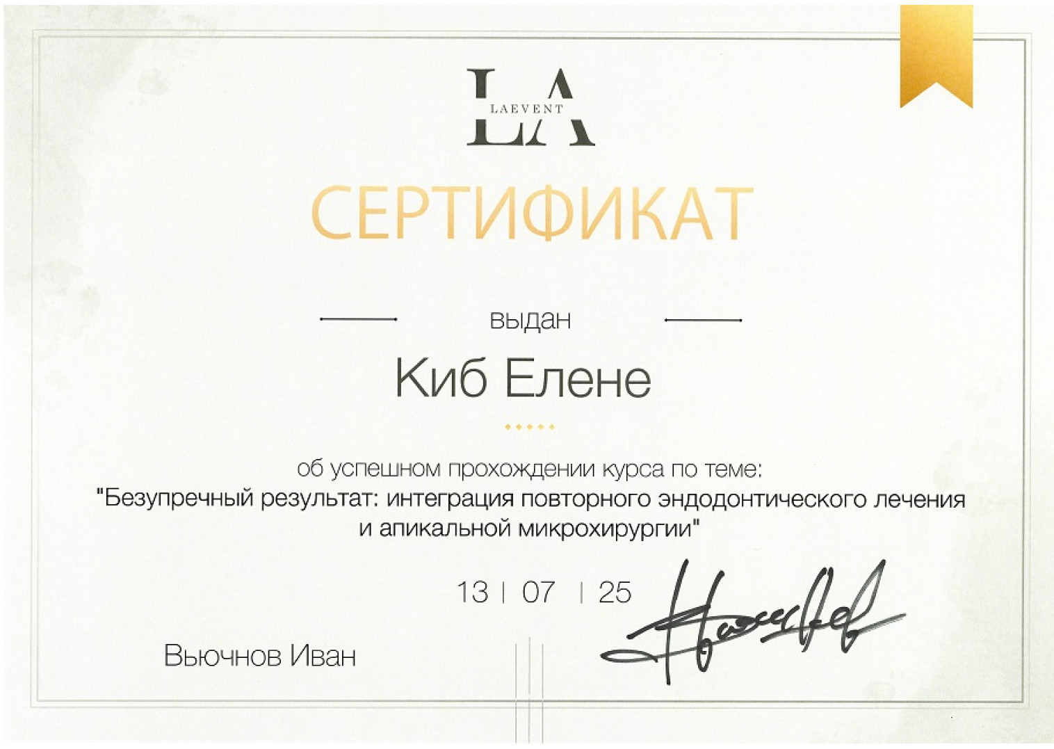 2025 г. — Обучение по образовательной программе «Совершенствование возможностей и способностей совершеннолетних личностей» по теме «Безупречный результат: интеграция повторного эндодонтического лечения и апикальной микрохирургии»