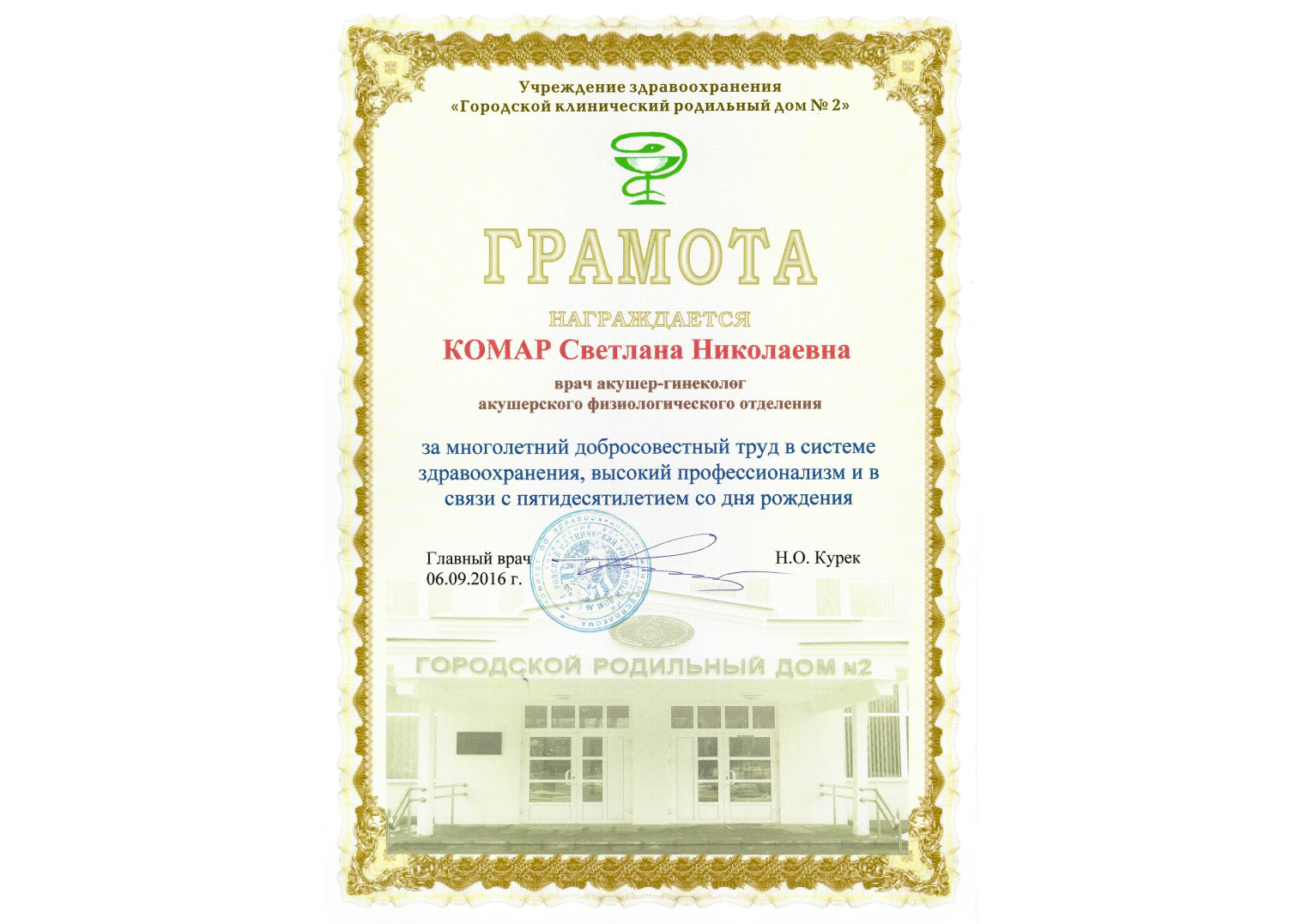 2010 – 2017 гг. — Врач-акушер-гинеколог для оказания экстренной помощи родового отделения УЗ «Городской клинический родильный дом №2»
