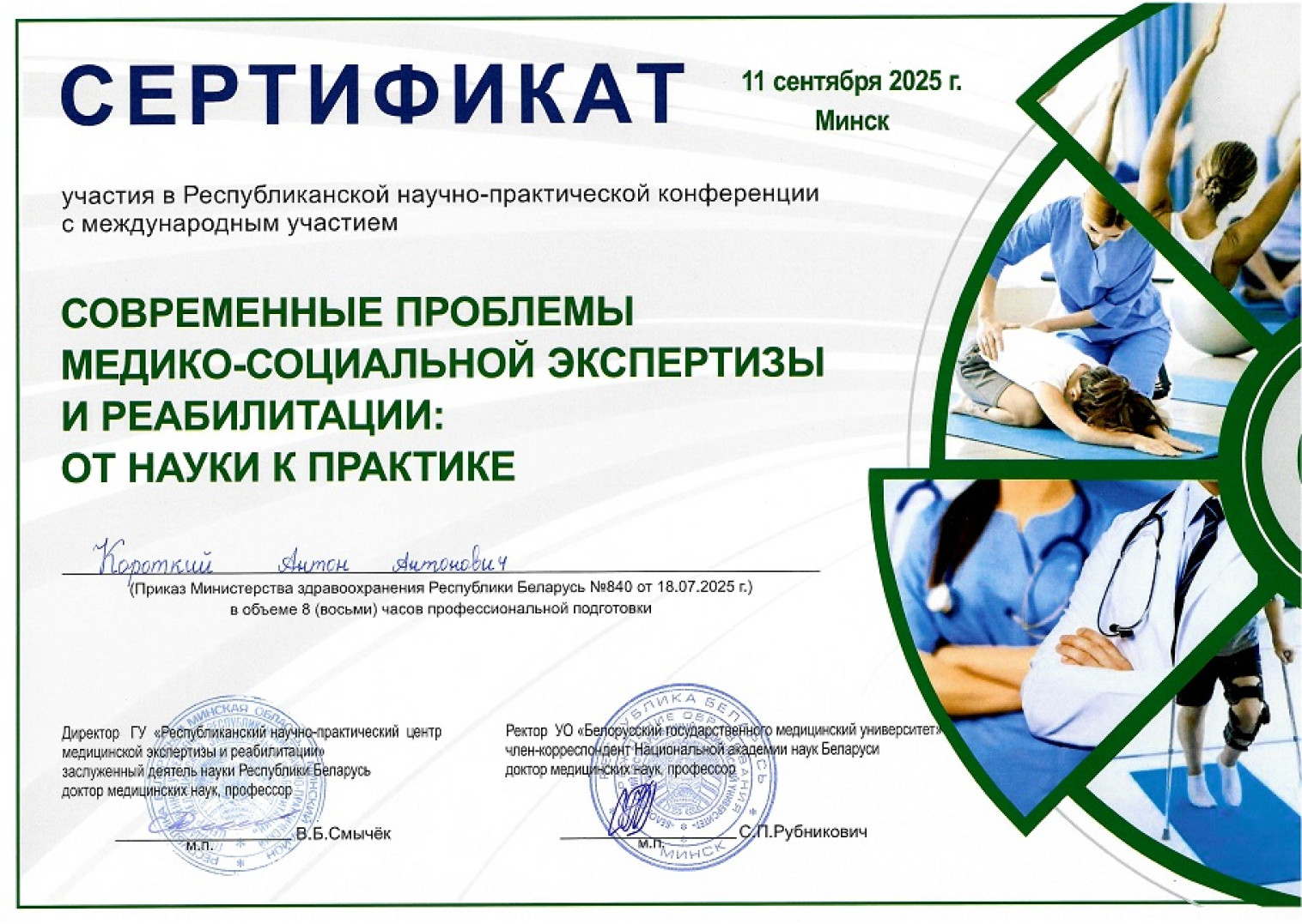 2024 г. — Республиканская научно-практическая конференция с международным участием «Вопросы медицинской экспертизы и реабилитации» (докладчик)