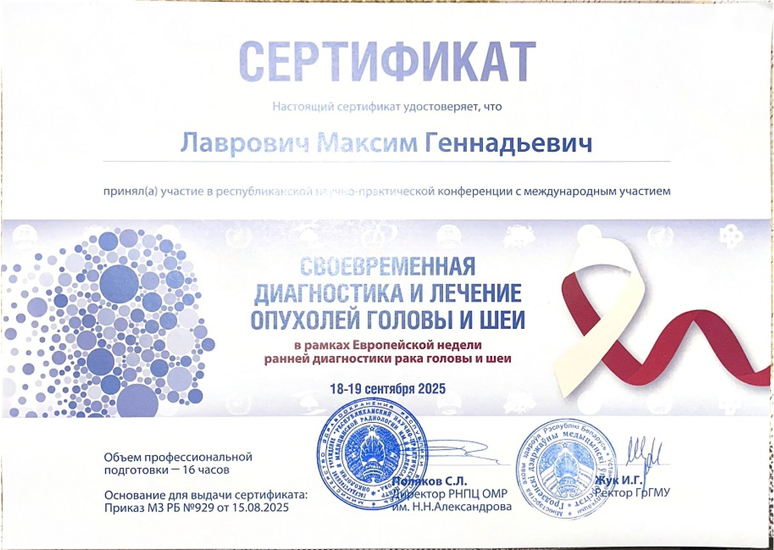 2021 г. — Участник республиканской научно-практической конференции и мастер-класса по мультидисциплинарному подходу в комплексном лечении опухолей головы и шеи, скринингу злокачественных новообразований