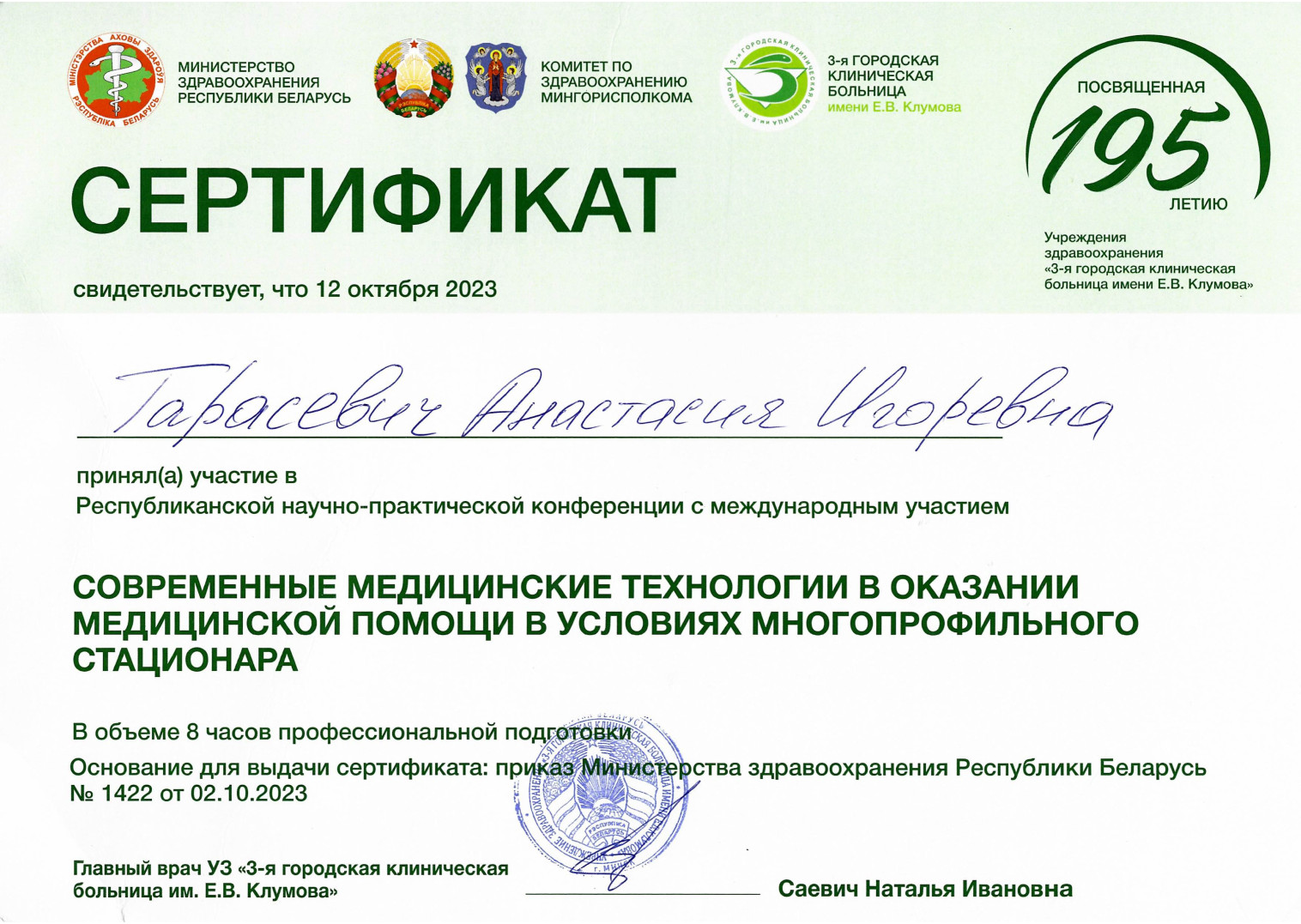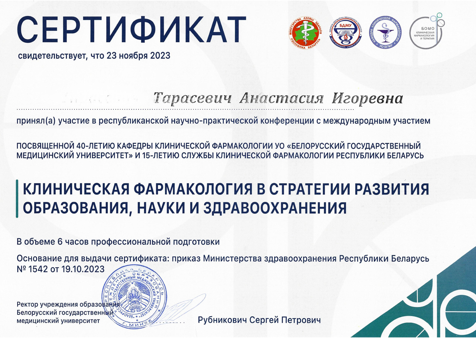 2023 г. — Ассистент 1-й кафедры внутренних болезней УО «Белорусский государственный медицинский университет»