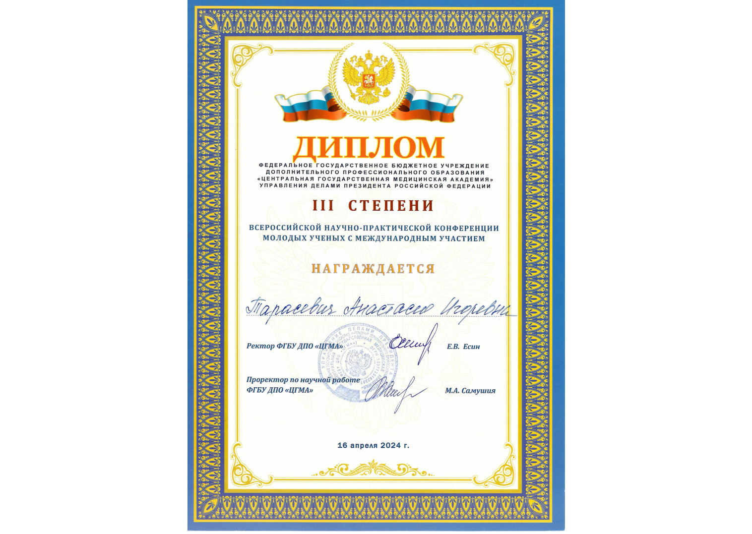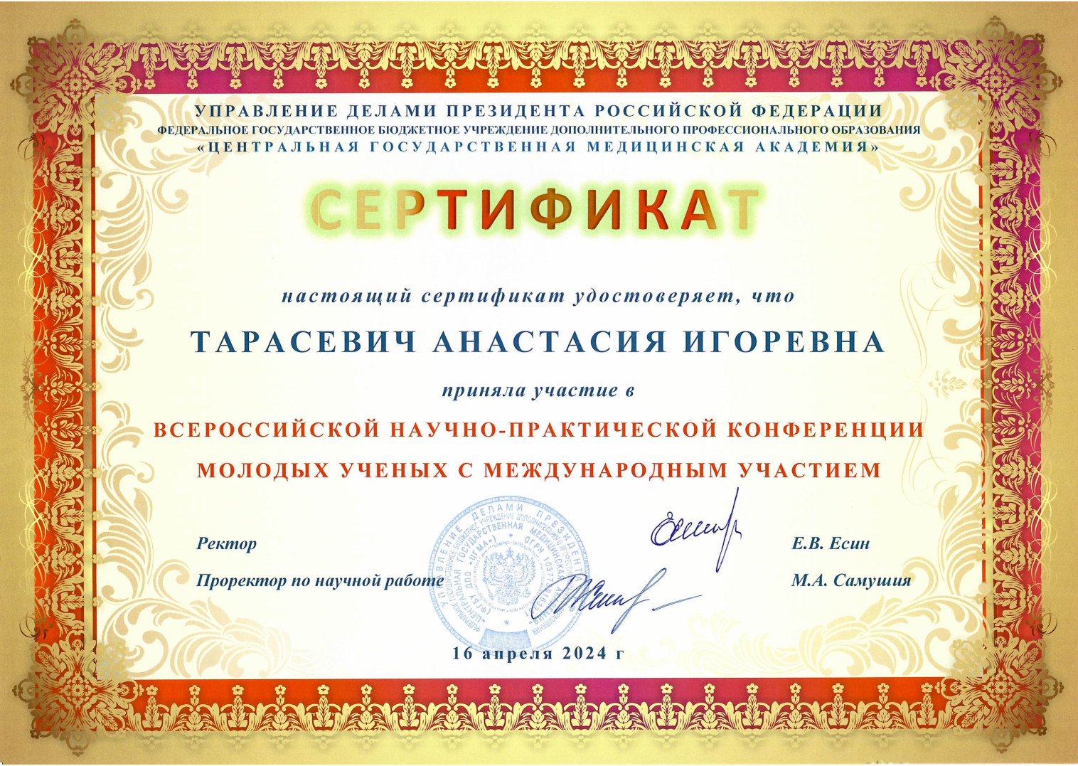 2024 г. — Курсы повышения квалификации по программе «Ультразвуковая диагностика в специальности: трансторакальная эхокардиография»